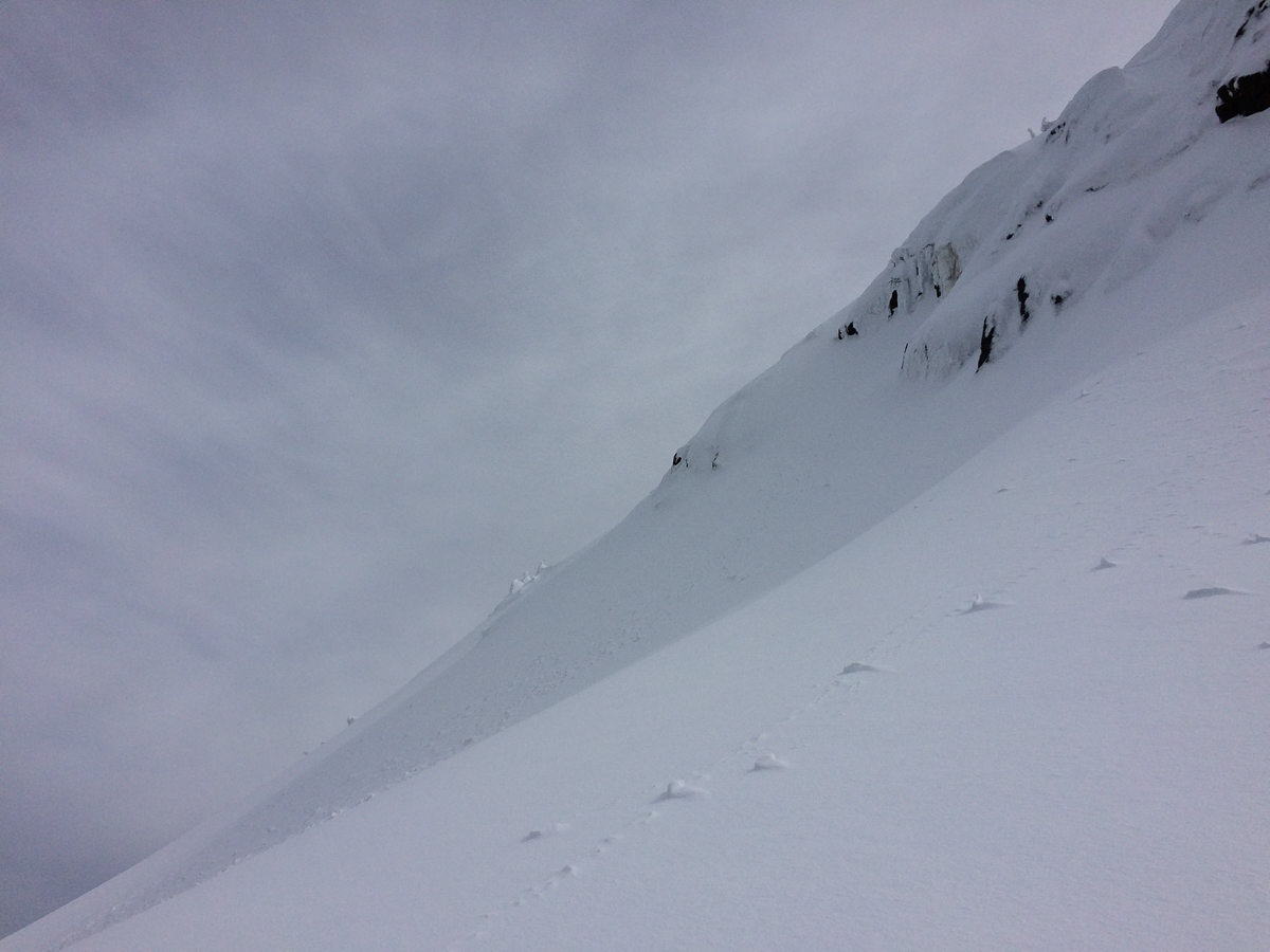 The route traverses the northwest-facing slope. Today, it was loaded with snow, creating an exposed forty-degree slope. And if the short run out to death wasn’t enough to deter us, the warming snow was. The high afternoon sun had melted the rain crust and left a sloppy mess in its place. We didn’t observe any evidence of recent avalanches, but there was plenty of debris on the snow slope ahead, fallen from the peak above. It was enough to persuade us to search for a different route.