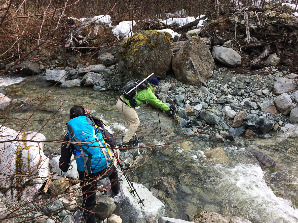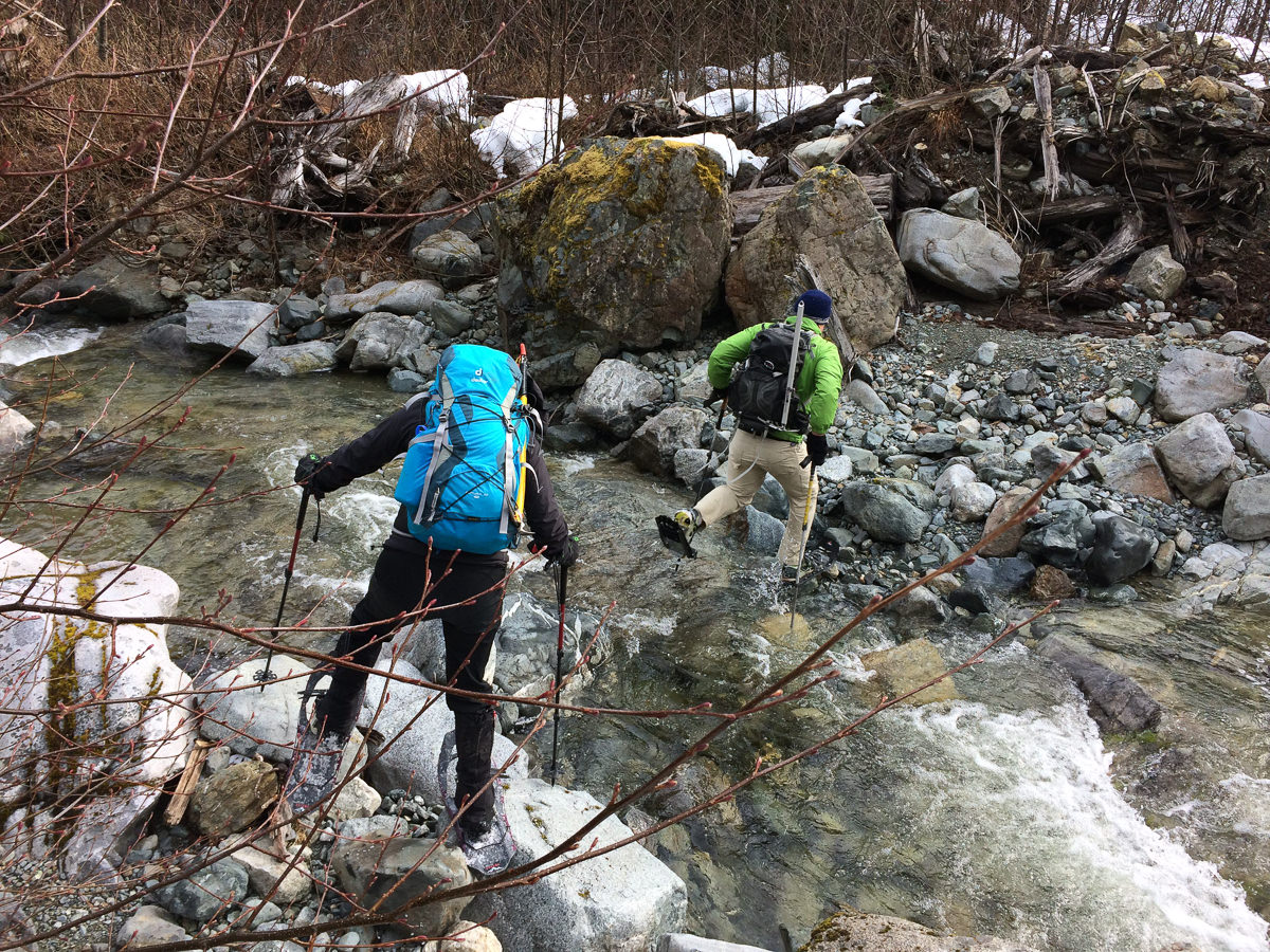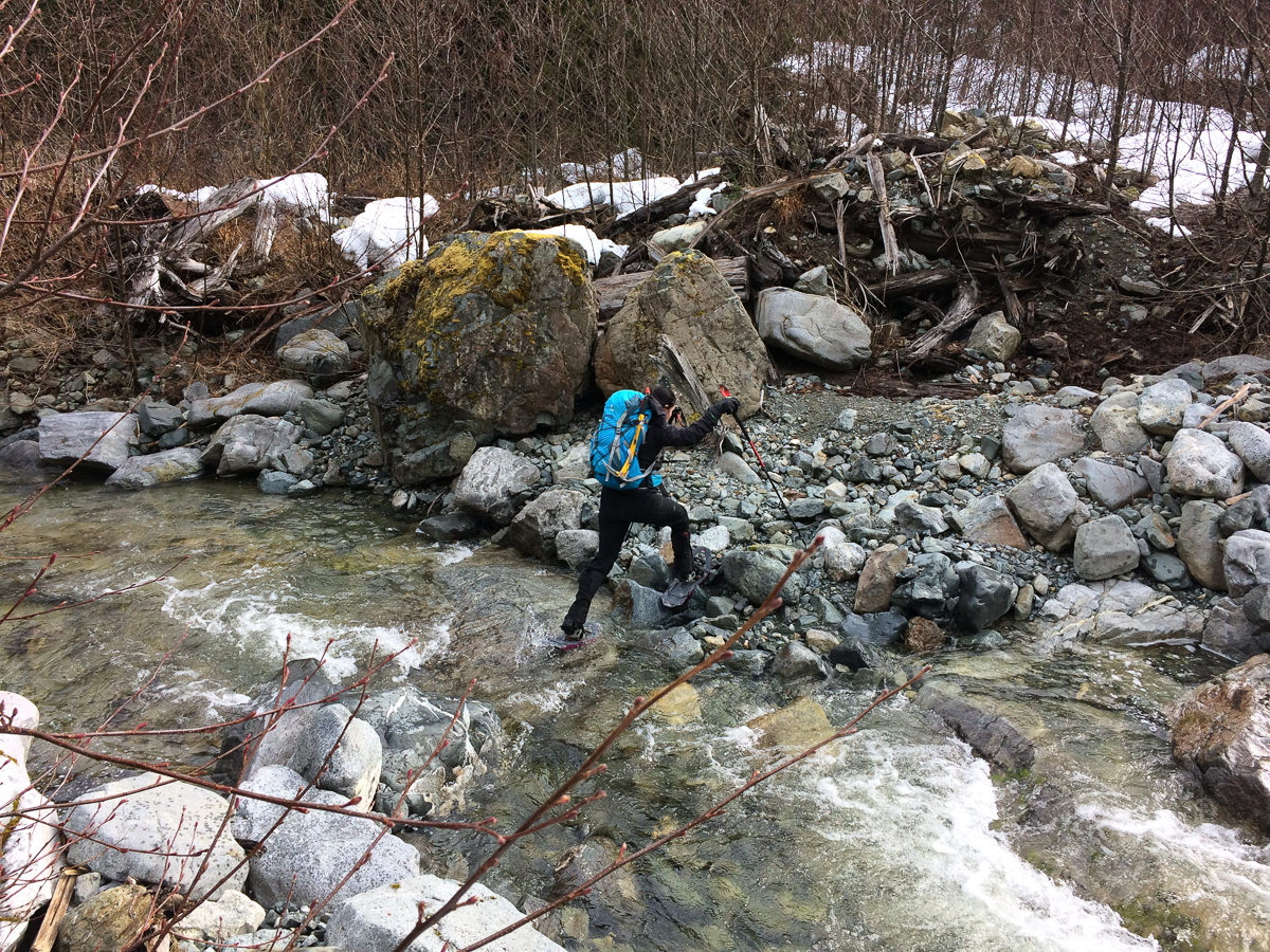 an easy water crossing in snowshoes