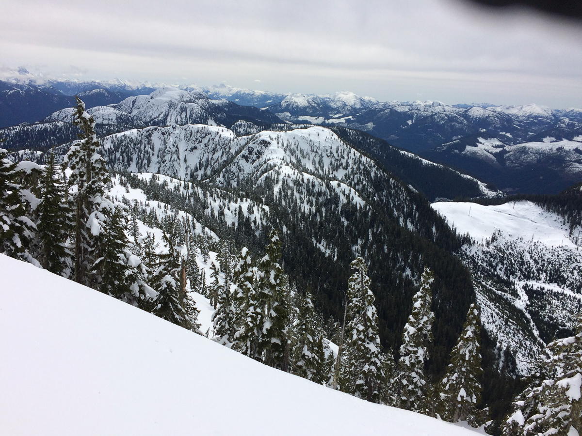 We took our first break at the edge of the replanted section and the mature regrowth (~1000m). It was a well-earned break: the route from the base of the gully was nearly a straight line from ~750 metres to 1100 metres. I drank some water and looked out over the Waring Creek Valley. Somewhere on the ascent, the sun had broken through the clouds and now illuminated the surrounding mountain tops. The view was spectacular! There was plenty of snow piled on all the surfaces, making them look more majestic than they probably are in the summer. The snow has a way of hiding all the logging slash. It makes the mountains look pristine, a winter cover-up of sorts. My mind wandered to the snow conditions. The route we used to ascend was rapidly softening: our descent would be slushy!