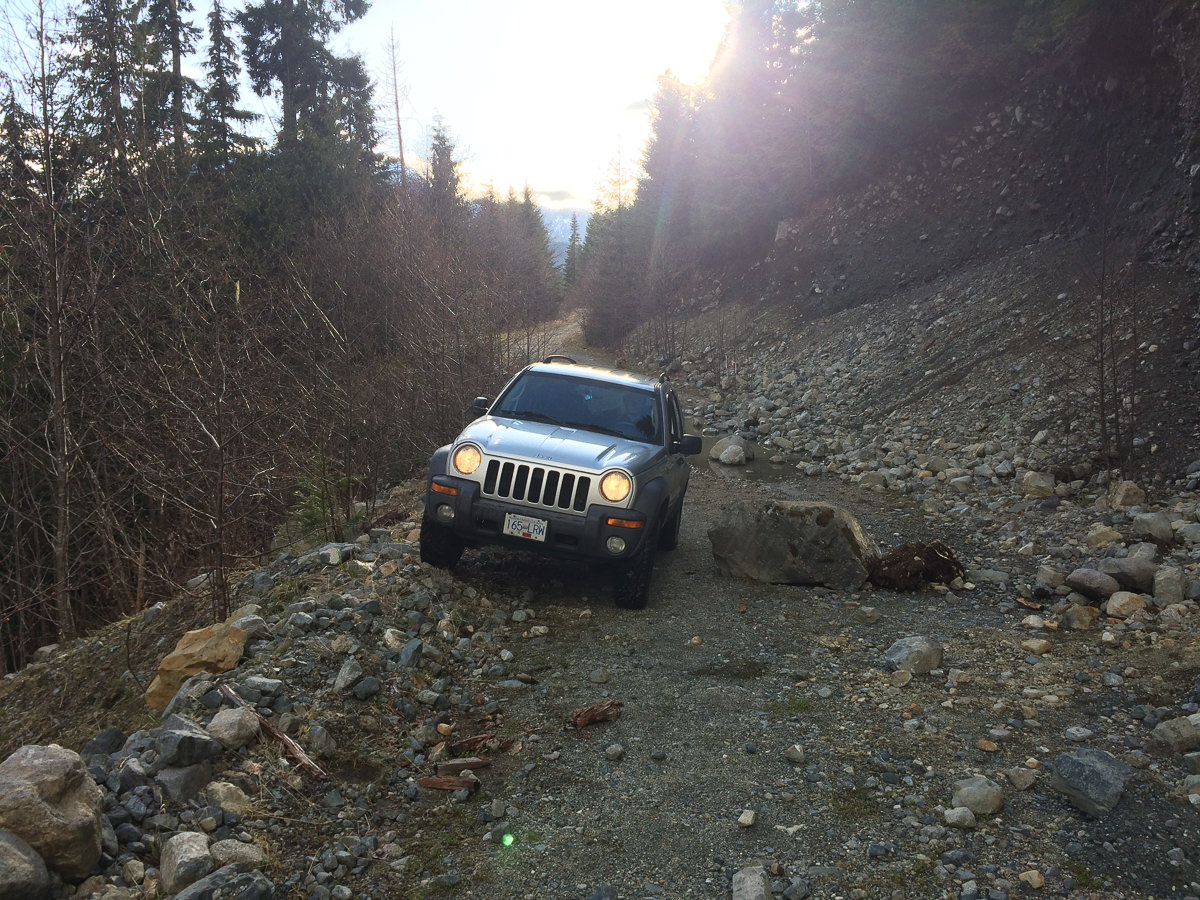 The still-barren alder reached well into the road grade, scraping at the Jeep’s sides and roof as we pushed by. The few easy cross-ditches didn’t slow us down, but by 700 metres there was a few inches of snow on the ground, enough to delay our forward progress. Examining our route, we were pleased to find that the road brought us well within easy hiking distance to the summit. We turned around on the narrow road, and drove back to Waring Road, idling at the junction for only a moment before the adventurer’s spirit overtook us and we continued up the steep logging road.