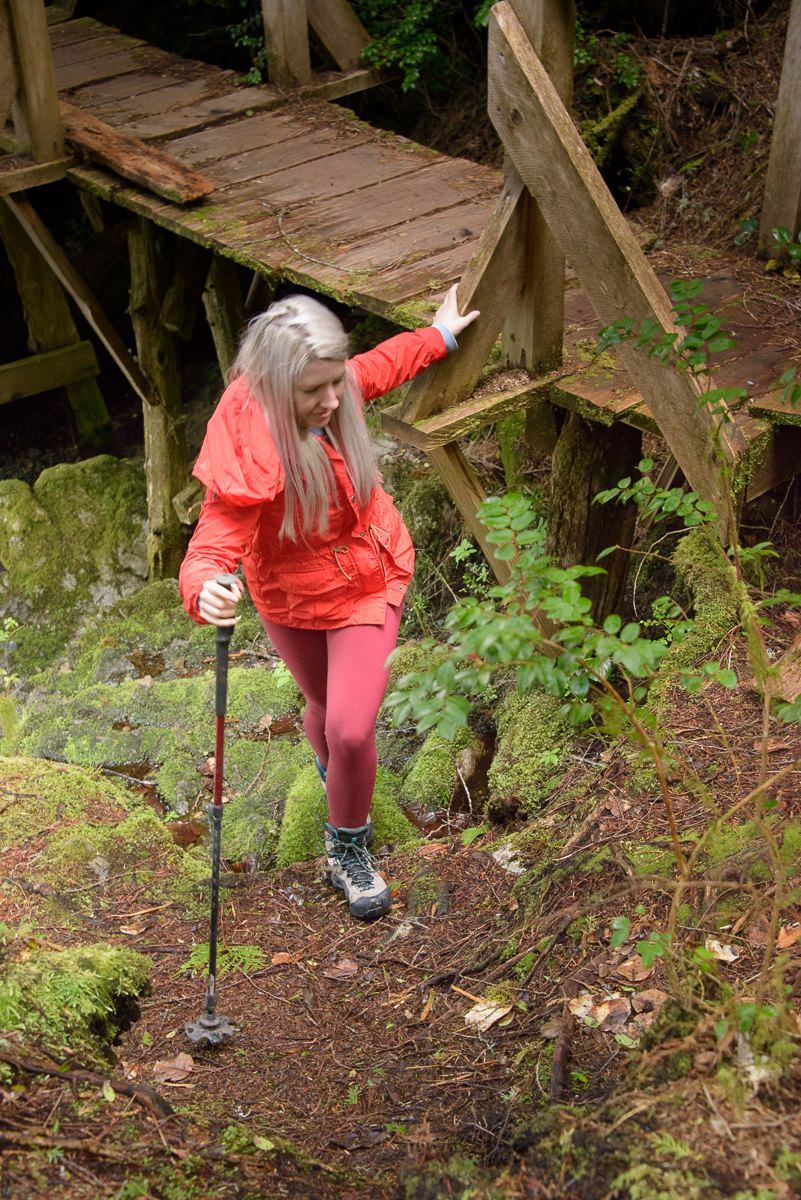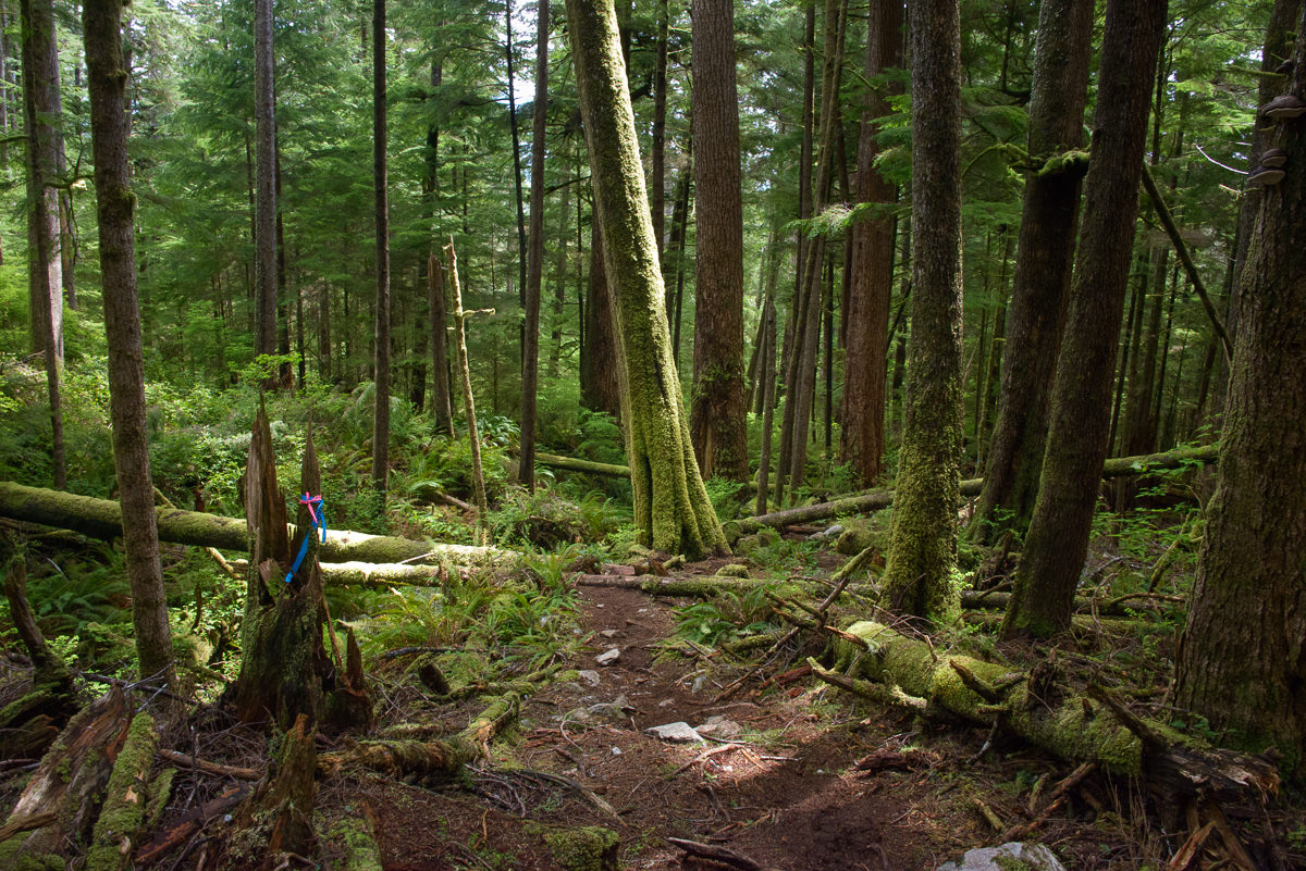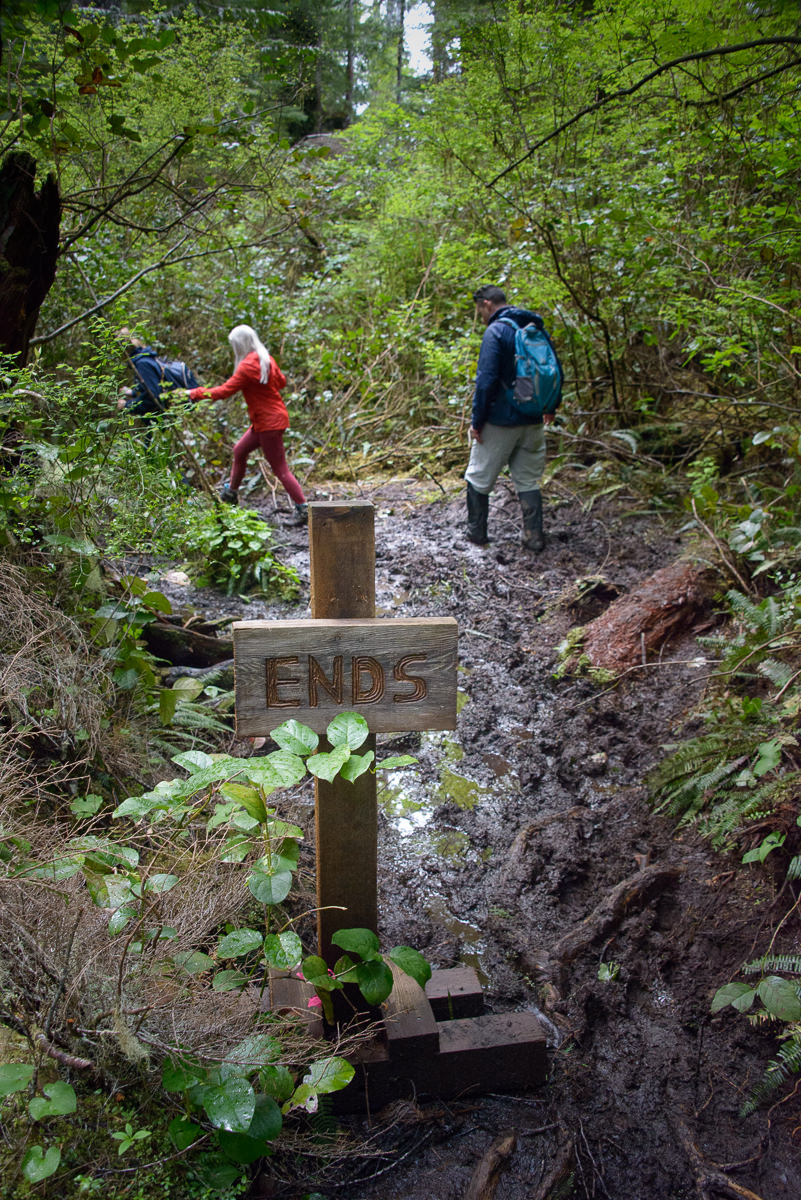 We loaded the boat around 9:00 am, and within 20 minutes we were dropped off on a skinny dock on the east arm of Meares Island. While our trip up Lone Cone Mountain was mostly dry once we rose above 100 metres, this route doesn’t gain elevation, and in many places it’s muddy. The first third of the trail is on hand-spliced cedar boardwalk. The long cedar planks sit atop narrow timbers just above the forest floor. It’s nearly impossible to step off the boardwalk, because the forest is so dense. The boardwalk acted as a guide, routeing us past large trees, salal, cedars, and more types of moss than I could even begin to count. The largest of the big cedars had signs naming them, such as the Tree of Life. Eventually the boardwalk gave way to muddy trail, marked with flags. After slogging through the mud for a short distance, we came to a sign reading: ENDS –my favourite part of the trail. It’s unclear to me what ends, or who Ends is, but in any case, the trail continues on through the mud. It’s well beyond the ends where the beauty of the trail is tucked away. The flagged route kept us on track as it guided us through the verdant forest.