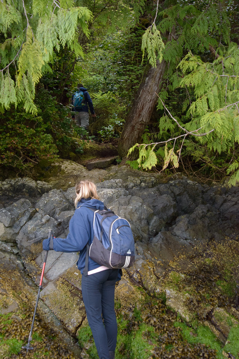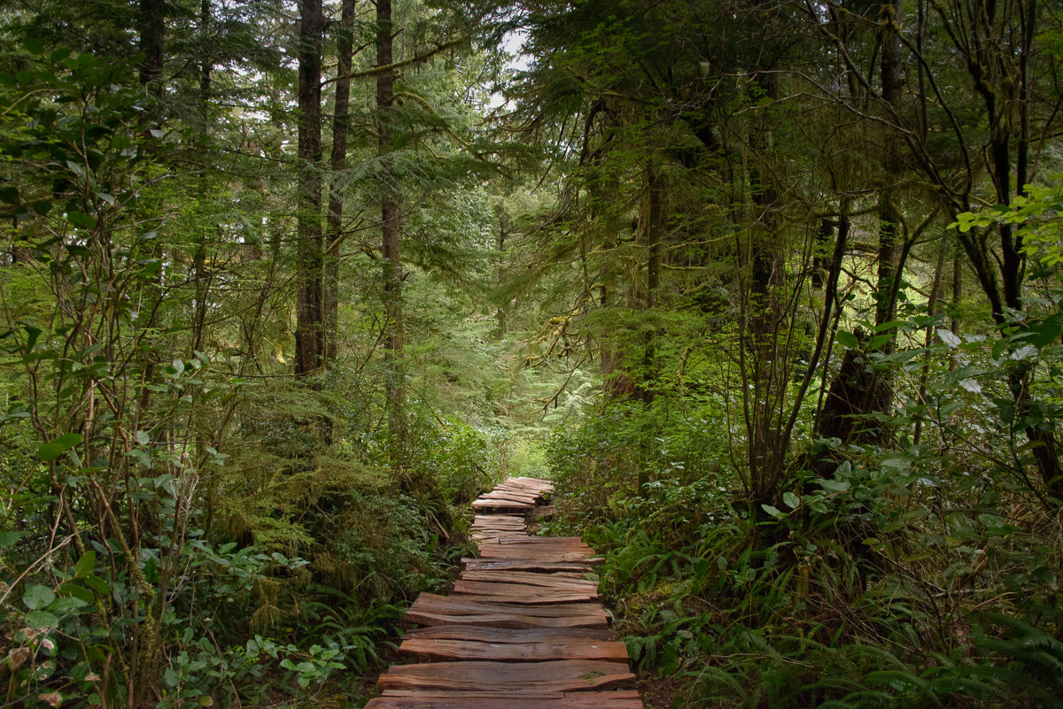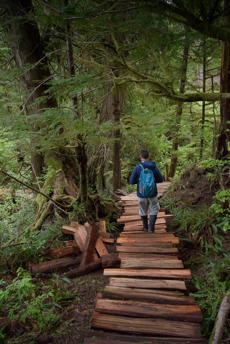 The volunteers who maintain this trail have done great work to develop the region. Despite being in the middle of a rainforest, we were able to follow the obvious path without fighting the bush. Eventually, we found that we were following the old Tofino waterline (now broken) as it parallels the audible but invisible coastline around this small section of the island.