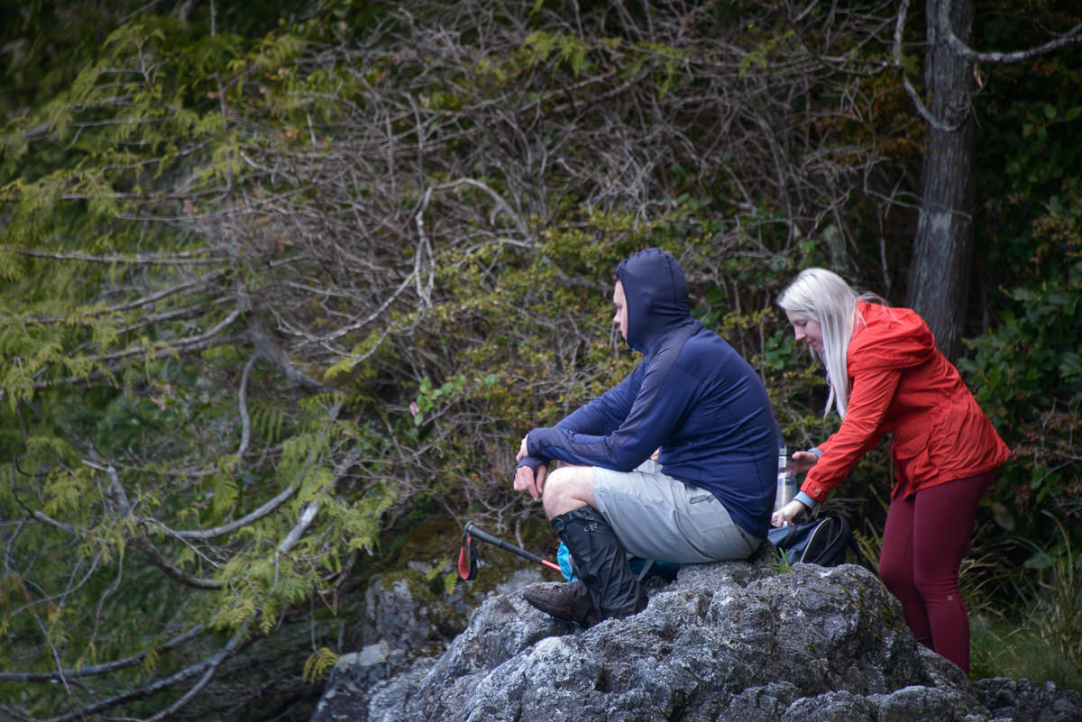 Michael and I were the first to arrive on the summit. We sat down to enjoy our lunch, with the view splayed out below us. We could see Tofino in the distance, but we were denied views to the southeast. The thick cloud covered Long Beach and obliterated any hope of seeing the Broken Group Islands. We sat for an hour before everyone in the group made it to the summit. In that time we watched the inlet, which was a broad intertidal mudflat when we arrived, fill with seawater. By the time the last members of our group arrived, it was nearly filled with water.
