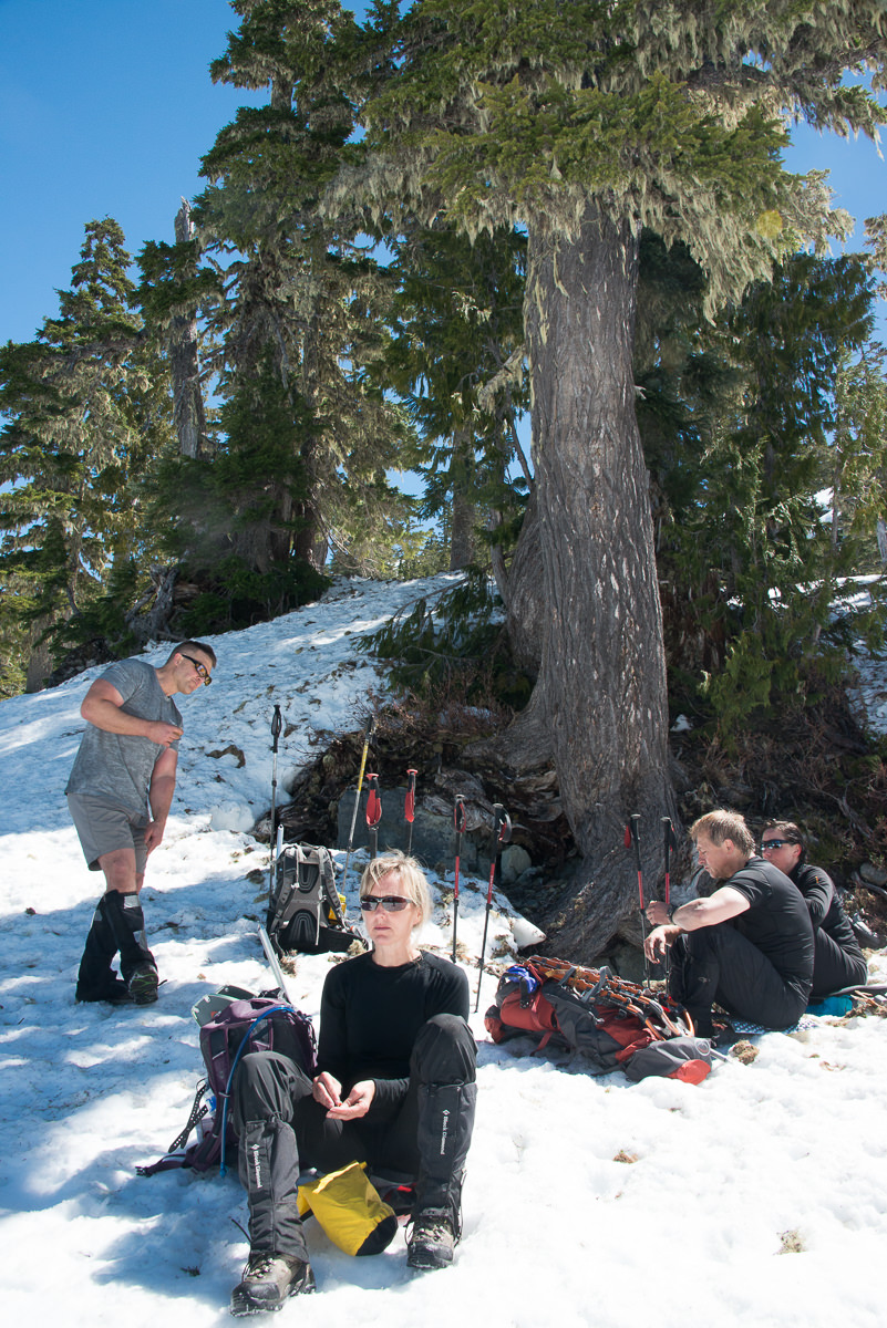 Very quickly after this obstacle, the grade eased off, and as we left the dense forest behind for the open alpine, snow accumulated beneath our feet and the long snowy slopes rising ahead of us created a dramatic contrast to the dark forest below. We stopped for a few minutes in the shadow of a huge alpine fir, to rest and admire the view. From our vantage, we could see Treo Mountain framed between two large trees. Treo was the first trip that I did with Shannon and Colleen, and I’ll confess that I felt a tear in the corner of my eye over the sentiment. No wait, that was the sunscreen in my eye — it was hot!