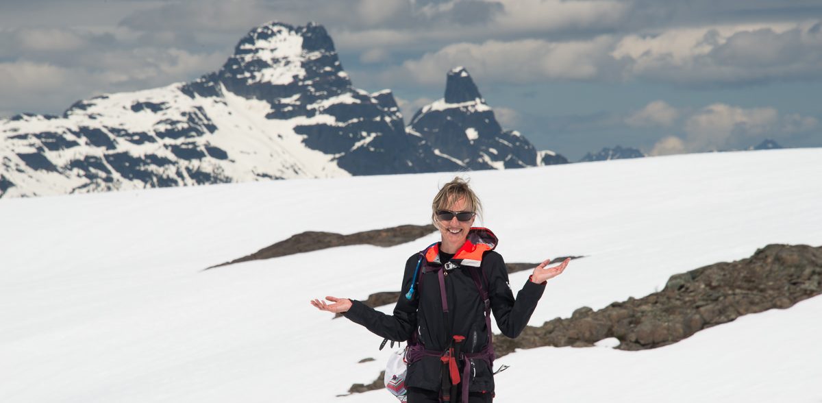 - a woman stands on the ridge below Mount Heber with Warden and Victoria Peaks in the background