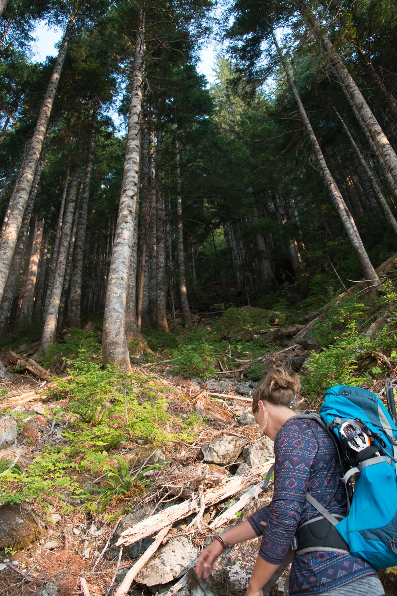 By the time we made it through the short section of slash to the open old-growth, sweat beaded on my brow and ran down my face. Even the forest canopy did little to relieve the heat as we trundled northwest through the forest. I was surprised how well our winter route worked even in the summer. Up gullies and along ramps that saw us huddled against rock faces to gain elevation, we worked our way up the mountain.