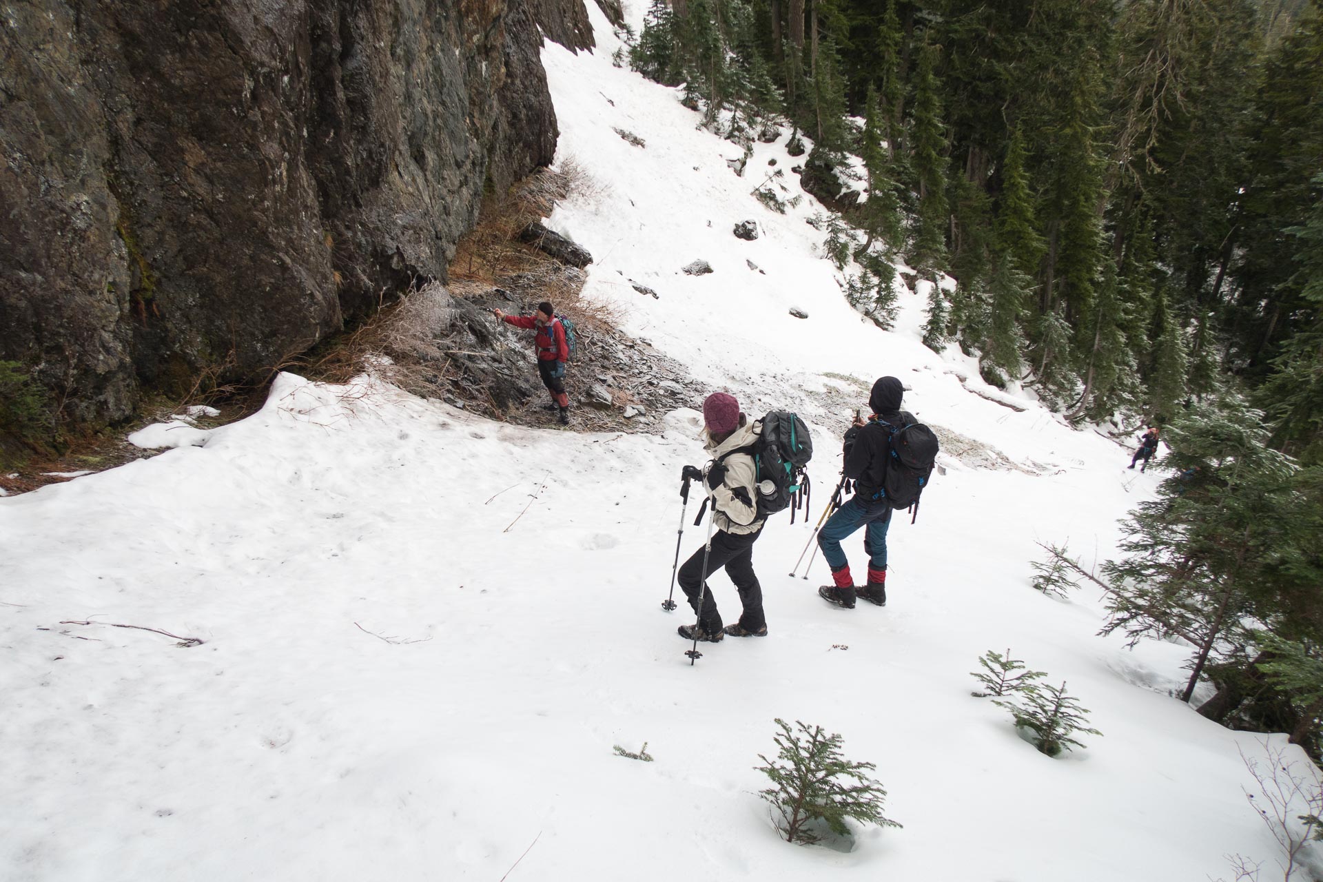 Most of the day’s work was in making it to the ridge. After pushing through the bush, we eventually hit some crusty snow that buried bush and covered rocks, making it easier to travel. We reached the treed ridge and continued toward the summit, following the crest of the ridge.