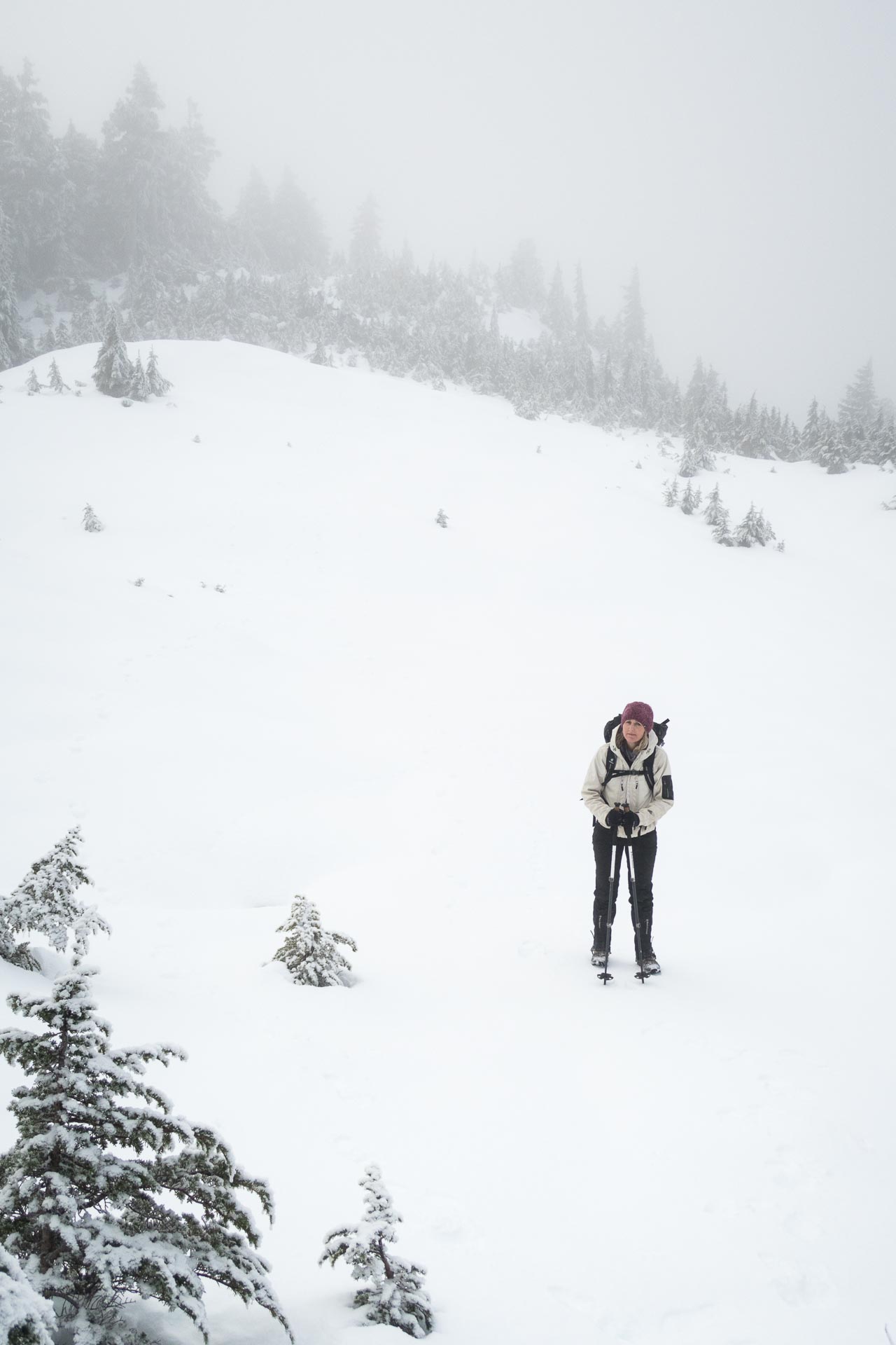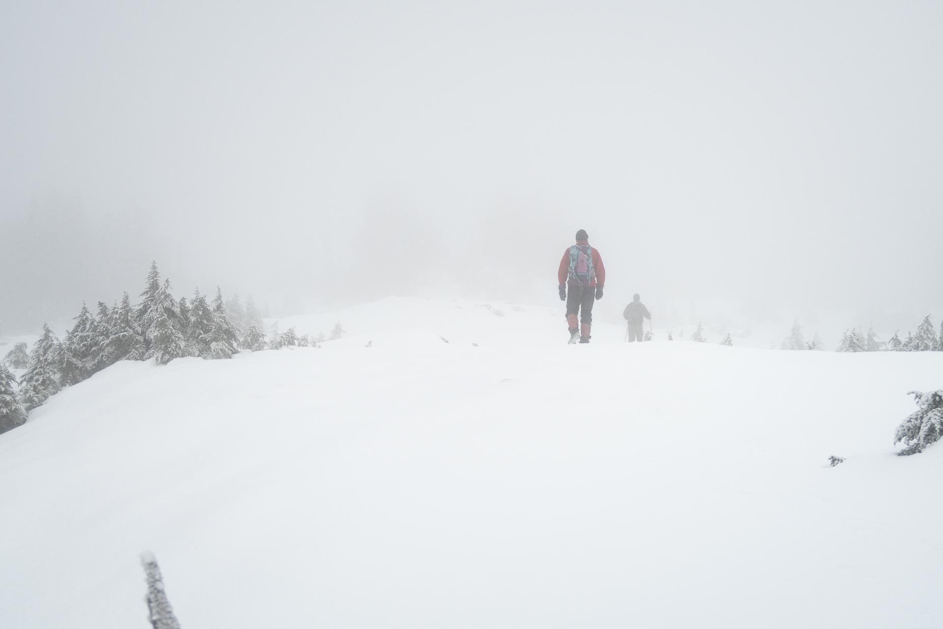 Calling this mountain a peak is a courtesy; in fact, it draws into question why one would even call it a peak. At no point did we come to anything that I would call pointy. And in the blowing cloud our visibility was poor, so we spent some time wandering the “summit” looking for the highpoint.