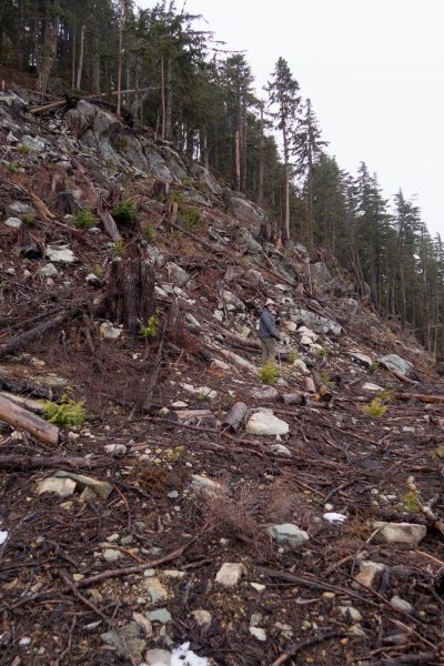 Here on the south-facing slope of the west ridge, we started our mega-adventure to the indistinct summit of Patlicant Mountain. Regardless of how undemanding the trip is, we still discovered some easy rock scrambling, wedging between tightly packed immature forest, slippery logging slash, and snow above 1200 metres (bizarre, right? Especially considering there was snow down to 300 metres in the Nahmint Valley!). Despite this short trip, we weren’t deprived of some of the common ailments of our longer trips: wet boots, snow up the pant leg and into the boots, and a few slips.