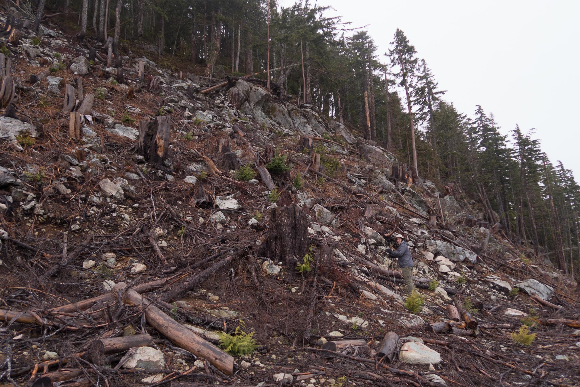 Here on the south-facing slope of the west ridge, we started our mega-adventure to the indistinct summit of Patlicant Mountain. Regardless of how undemanding the trip is, we still discovered some easy rock scrambling, wedging between tightly packed immature forest, slippery logging slash, and snow above 1200 metres (bizarre, right? Especially considering there was snow down to 300 metres in the Nahmint Valley!). Despite this short trip, we weren’t deprived of some of the common ailments of our longer trips: wet boots, snow up the pant leg and into the boots, and a few slips.