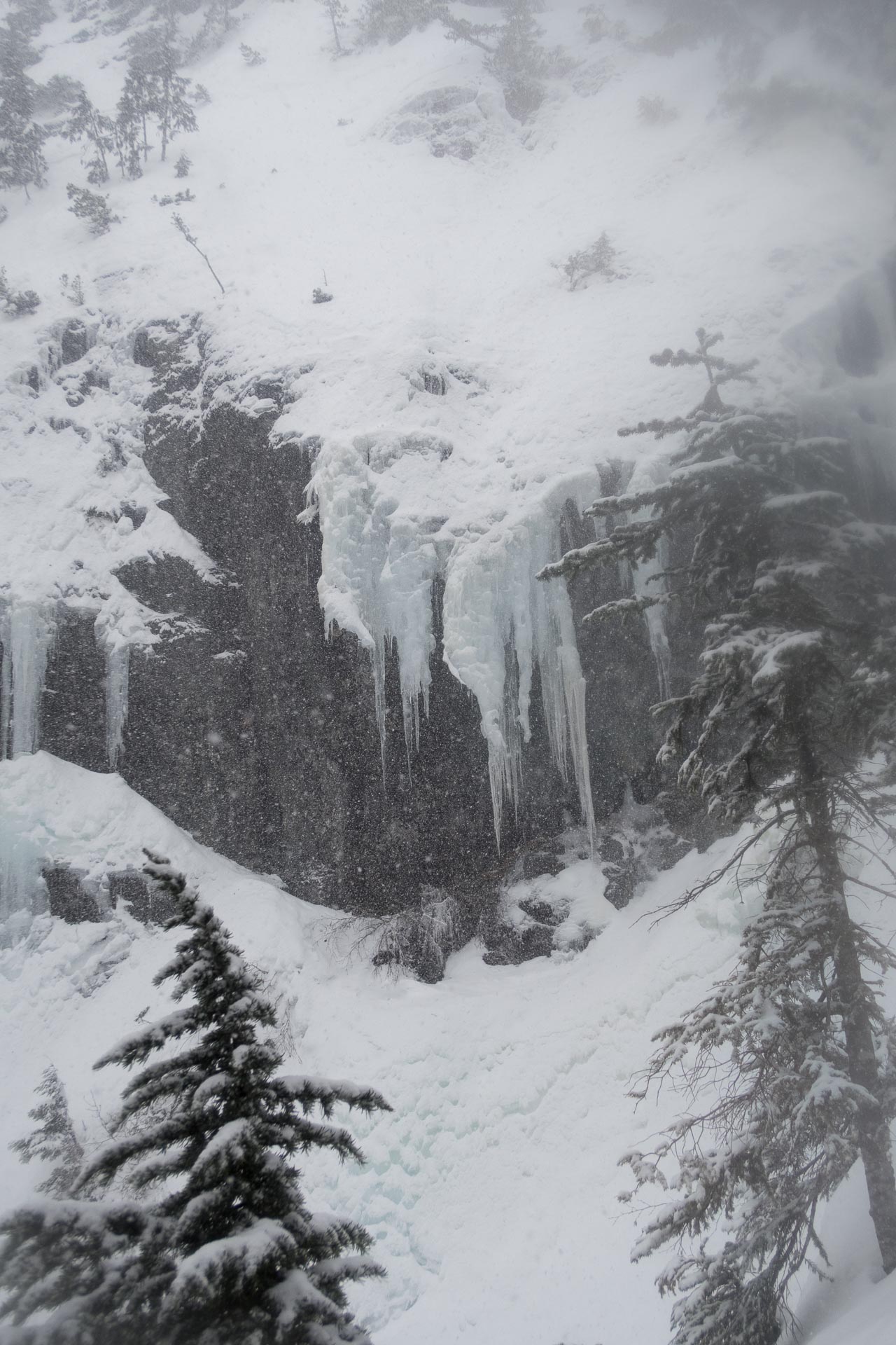 We mostly kept to the height of the land, diverting wherever obstacles warranted. At times the snow became ice, and all around us, the cliffs were decorated with spectacular displays of waterfall-ice; in others, we plunged knee-deep through the solid crust into the crystalline snow below. As we ascended beyond 1000 metres, the temperature dropped, and I was forced to add a third layer to my gloves and put a puffy jacket over my windshield.
