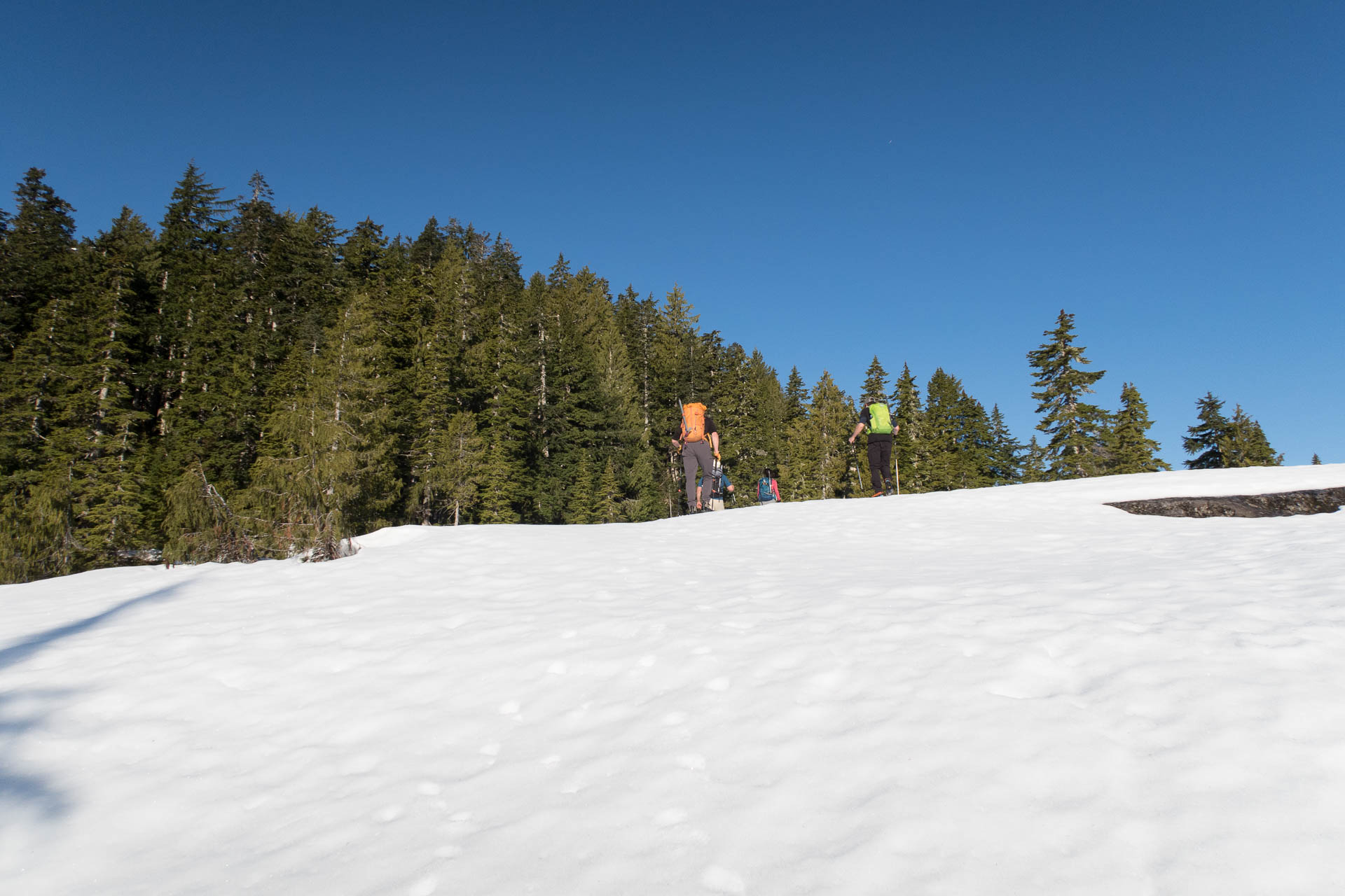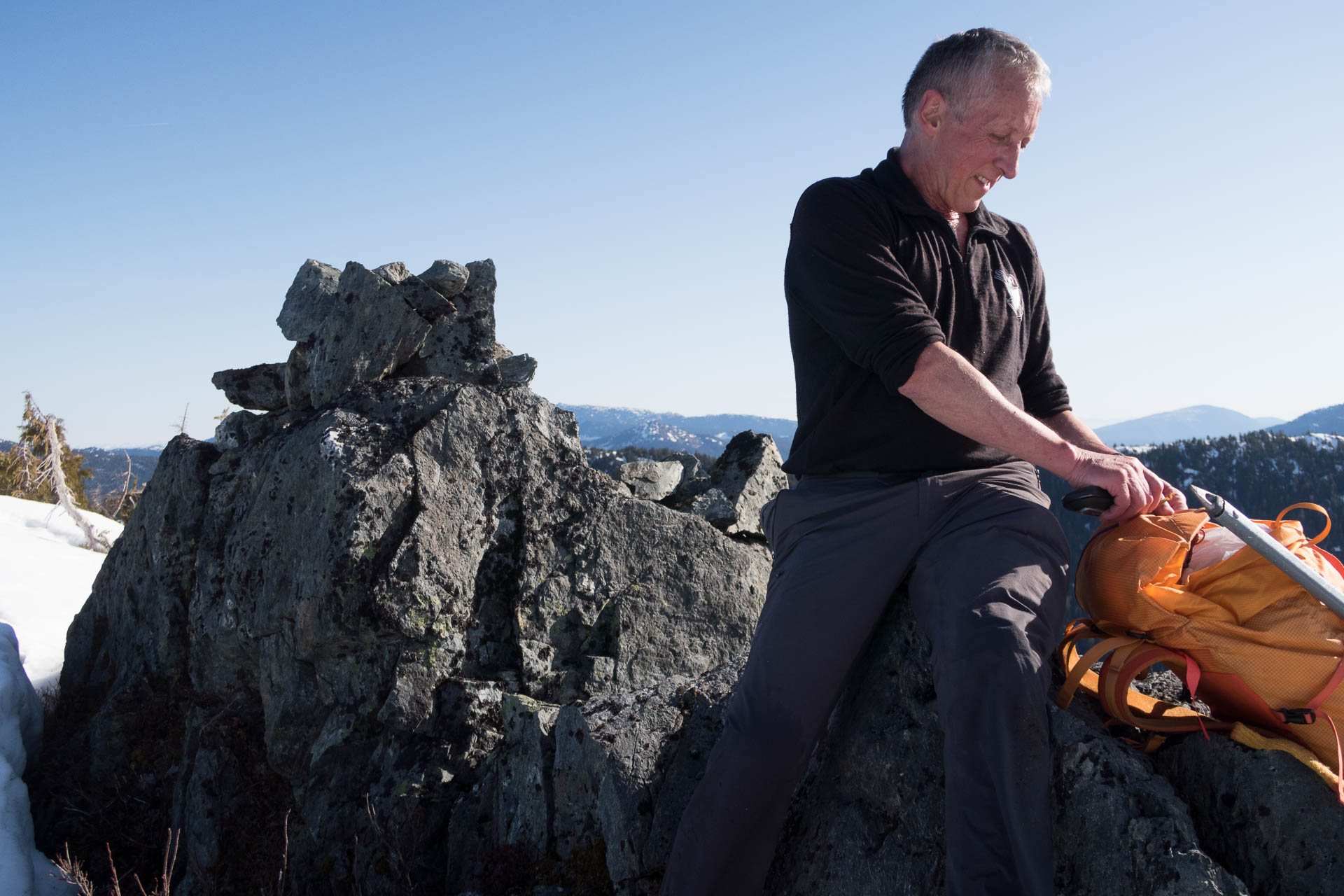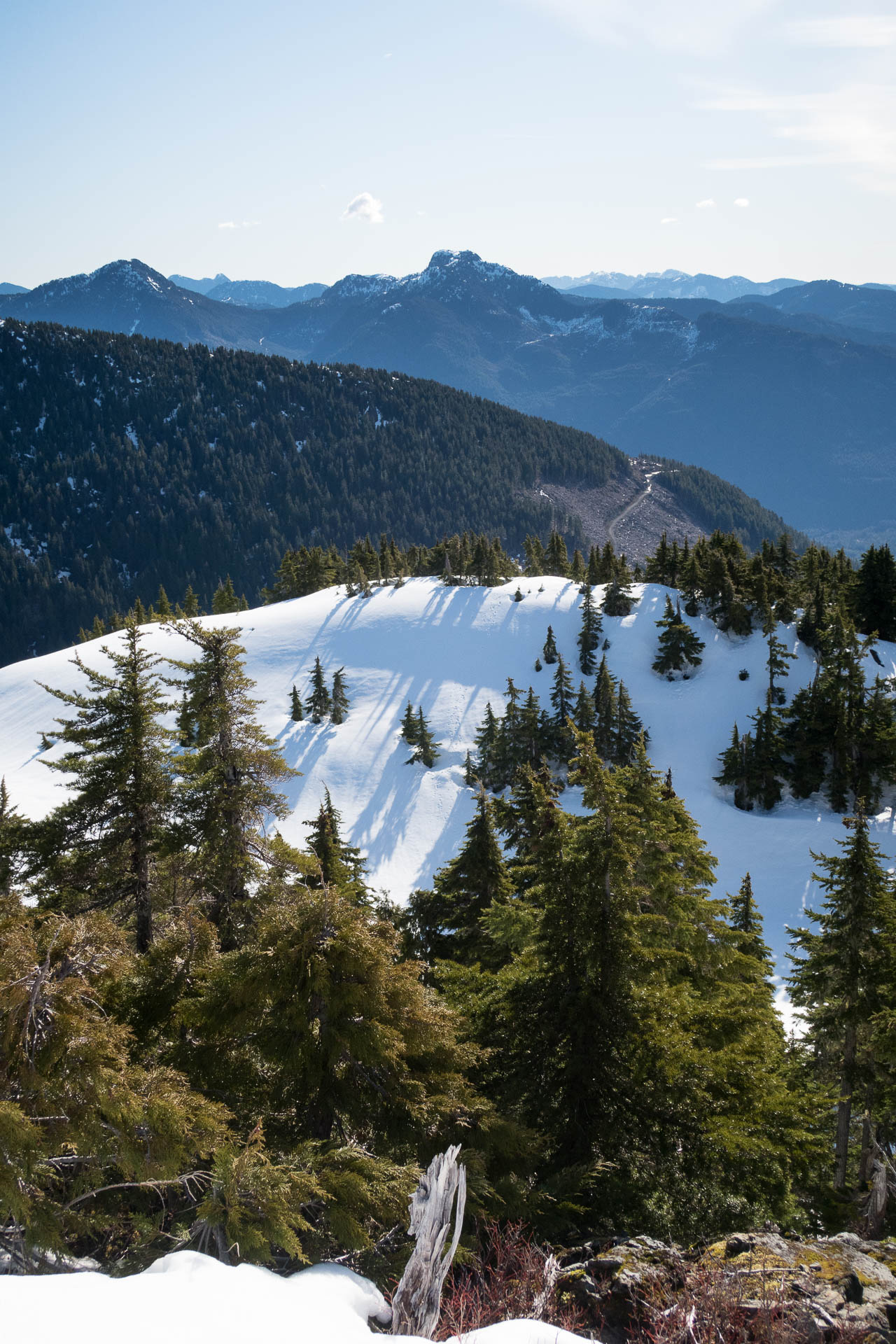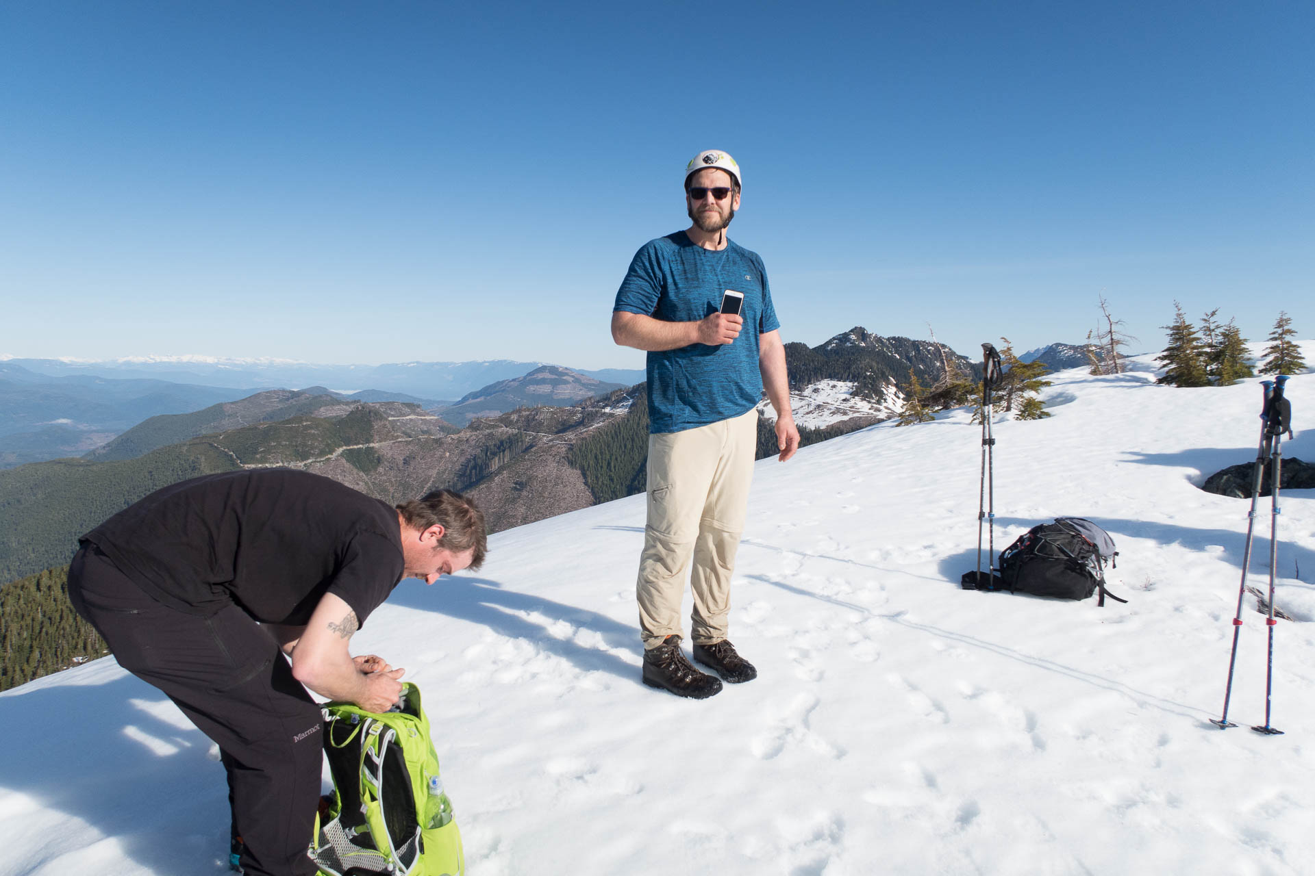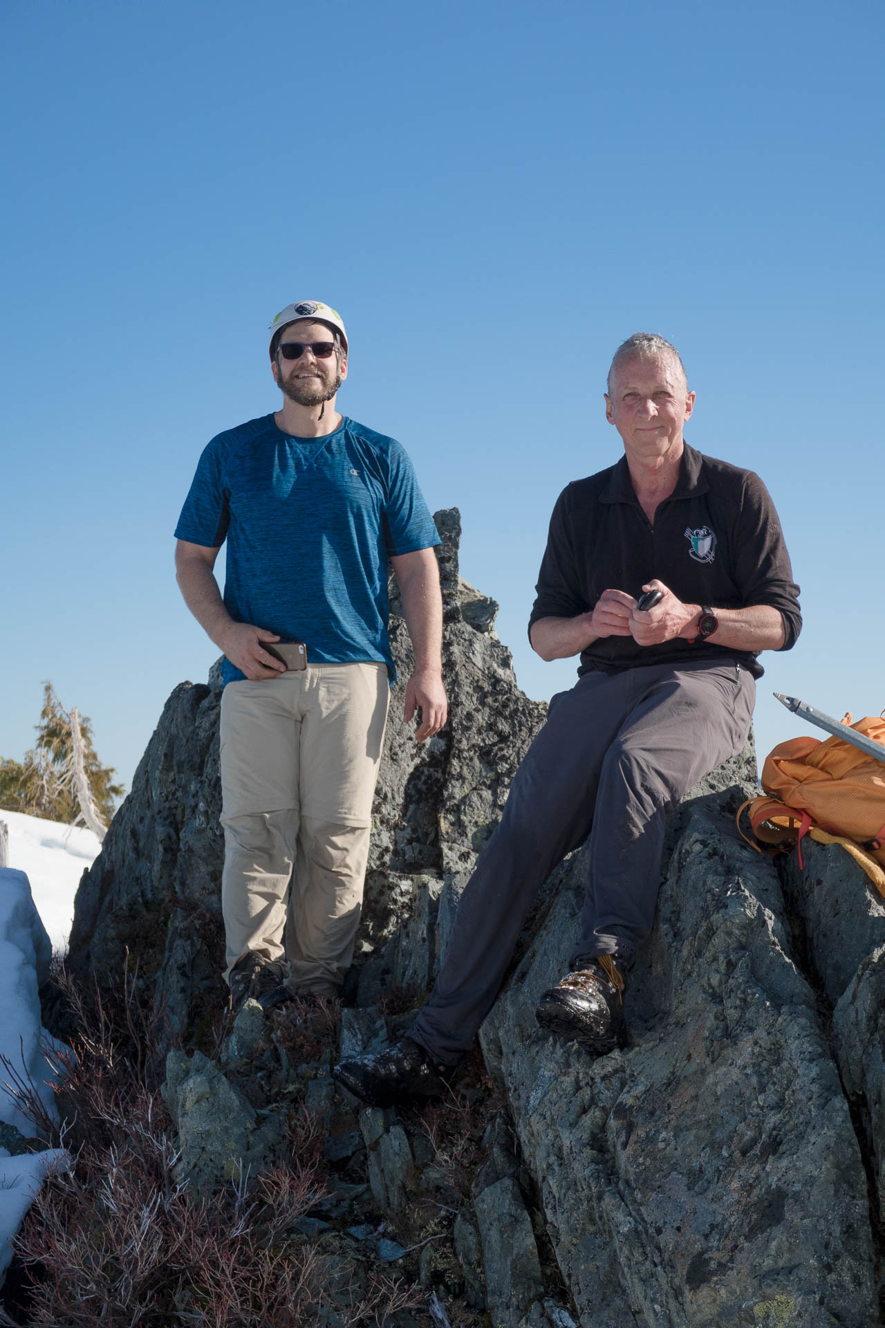 We parked near the end of the road at 900 metres elevation. From here, the summit was a very quick hike through the crunchy snow and alpine shrubs along the east ridge to the summit. We severely overestimated the day’s objective, and in the heat of the day, we followed Phil as he would his way around the short bluffs, up a bushy gully or two, to arrive on the summit by 9:30 am.