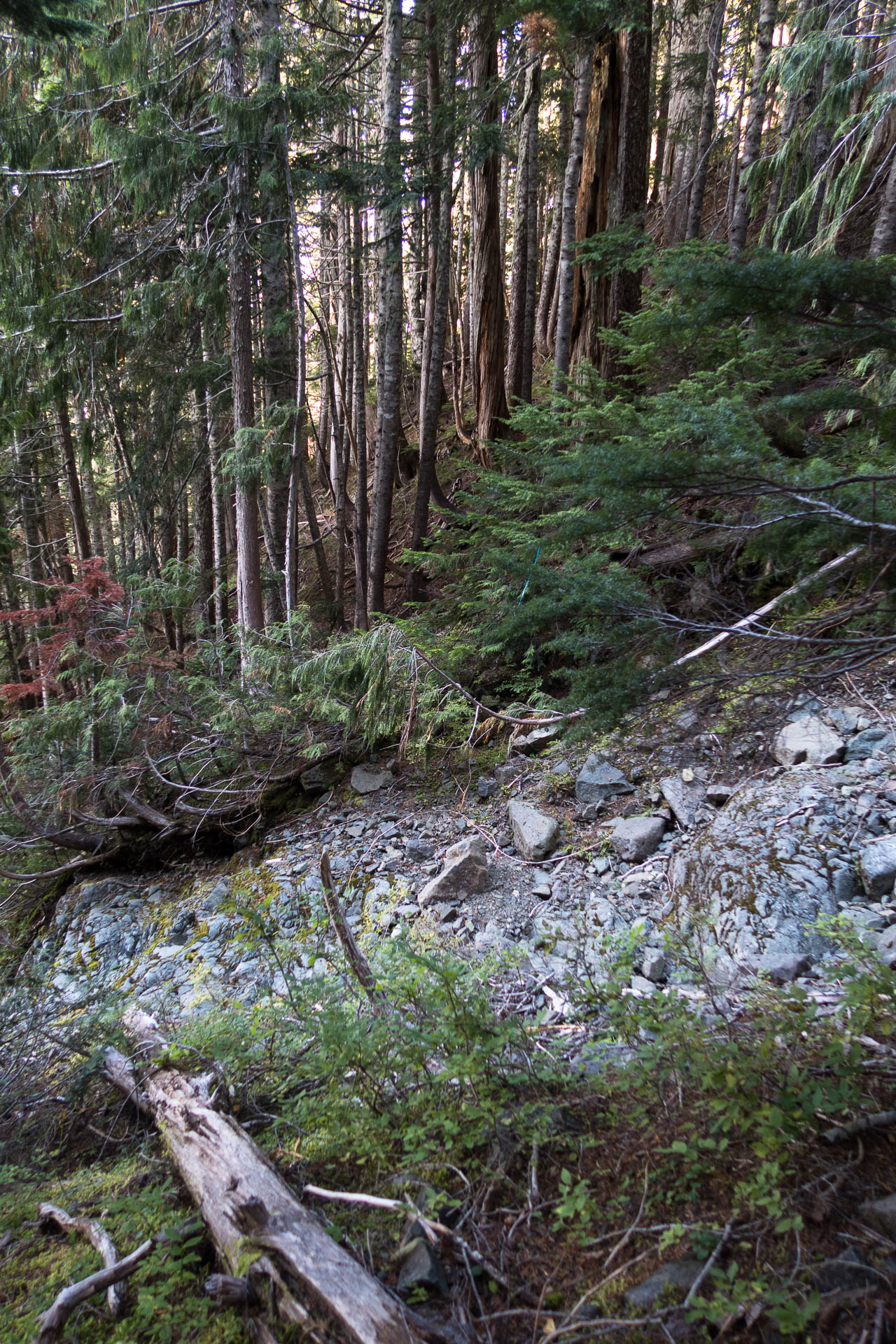From the road’s terminus, we piled into the cut-block and headed down through the dry watercourse to the left side. Paralleling the dry feature, we headed up and over a mess of blowdowns through waist-high blueberry and azalea that easily parted, until we found ourselves subsumed below the old-growth canopy. As we climbed, the bushes thinned, and eventually we crossed the first watercourse (~ 1025m) and traversed over to the second watercourse (~1090m).