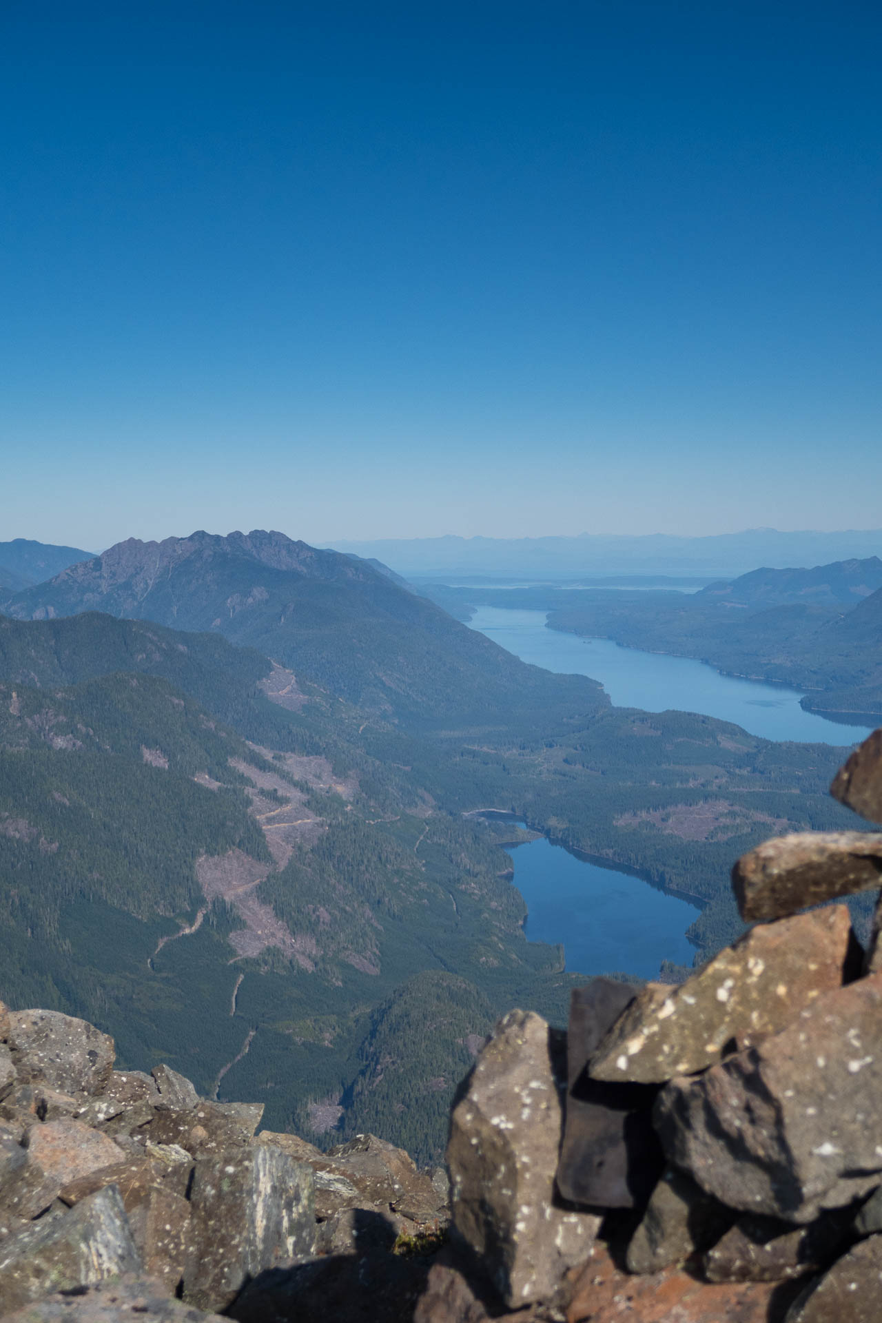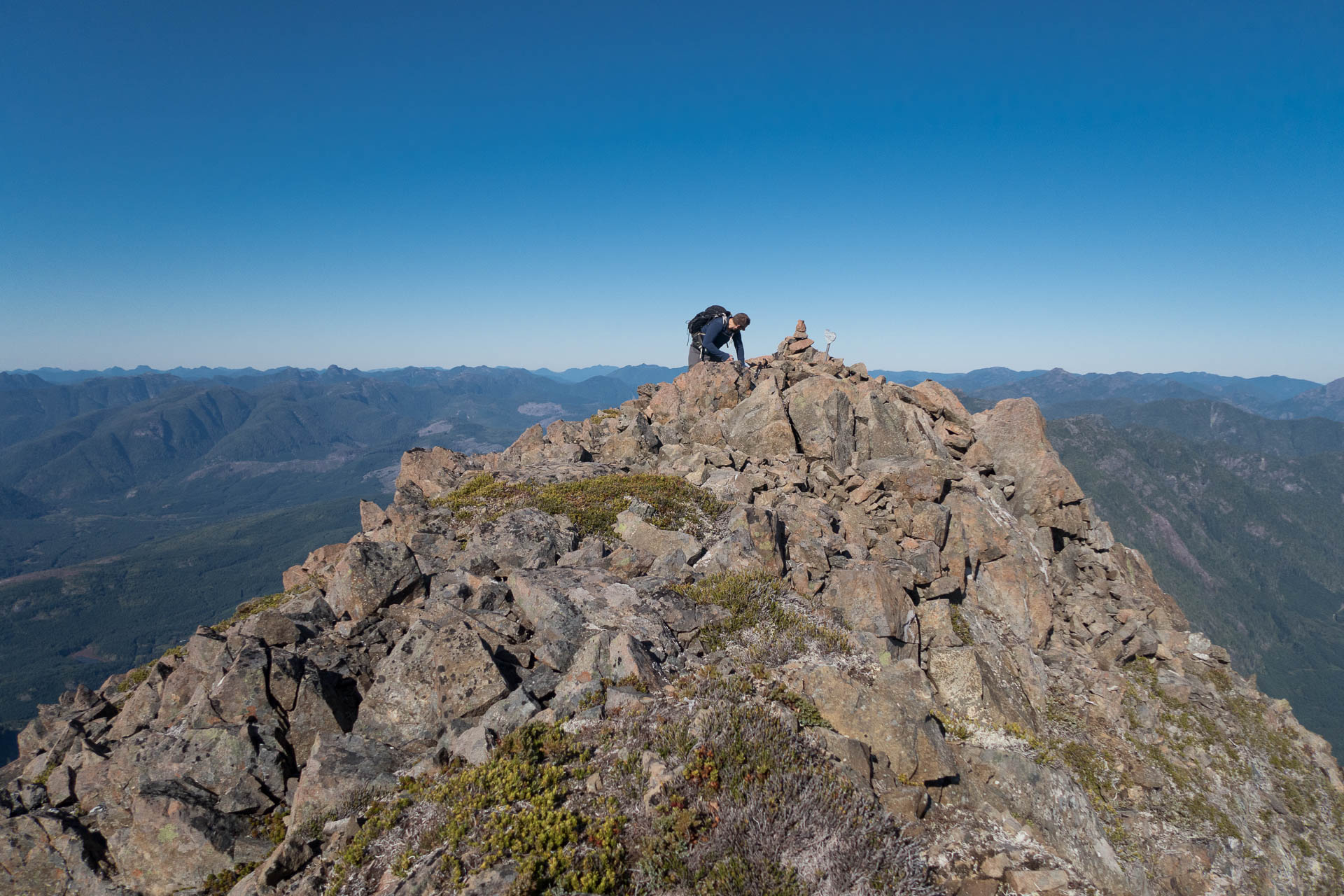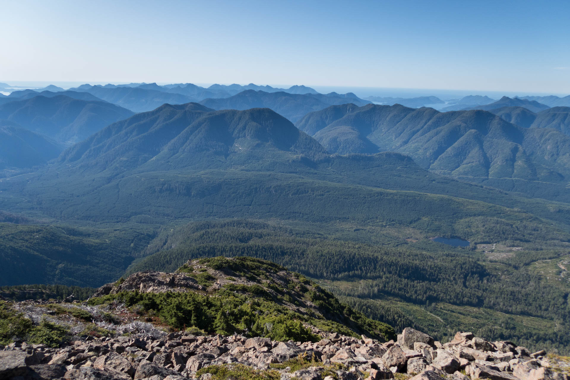 We arrived on the summit of Pinder Peak before 11:30 am, ahead of our schedule. We rewarded ourselves with an extended snack break on the windy summit. We couldn’t help but gawk at the surrounding features. The clear skies gave an excellent panoramic view, including out Tasish Inlet to Kyuquot Sound.