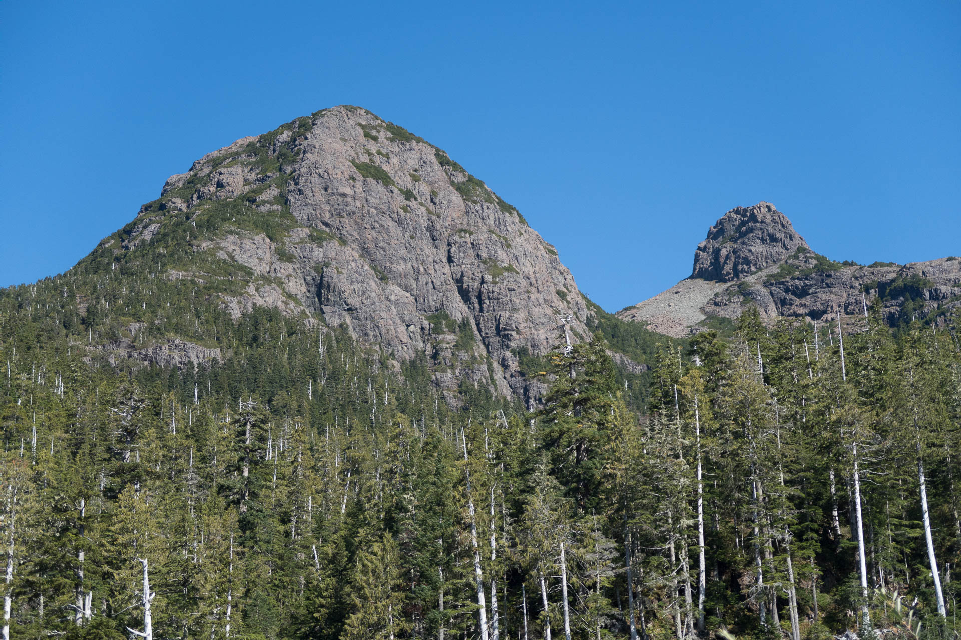 If you’ve ever driven along by Atluk Lake, you’ve probably spotted the Pinder massif out your window. It rises from the wooded shores of the lake as a rocky tower that begs the mountaineer to climb it. The summit massif is marked by two prominent features, either of which is a worthy objective, though the subpeak is probably more of a challenge.